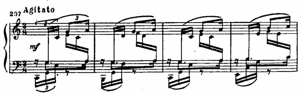 Мелодизированный бас, его ритм, фактура, характер движения на протяжении всей прелюдии остаются неизменными. В то же время собственно мелодия уже при повторном проведении обогащена выразительными деталями (короткий форшлаг, трель), диапазон ее постепенно раздвигается, с возрастающей резкостью звучит затактовая фигура, упирающаяся в сильную долю следующего такта. Повышенная экспрессивность исходит от разрывающих рисунок пронзительных трелей, стремительно взлетающих и низвергающихся пассажей.