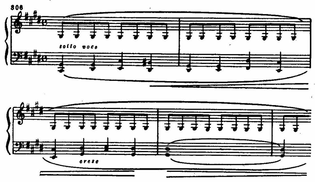 Резко меняется художественный смысл и выразительное действие органного пункта. Благодаря перемещению темы в низкие регистры органный пункт на gis звучит сильнее, ярче. В совокупности с дробно стучащим неизменным ритмом он предстает как воплощение чего-то неотвратимого, угрожающего. Звуковые наплывы, мощные нарастания с внезапными спадами дорисовывают фантастическую картину.