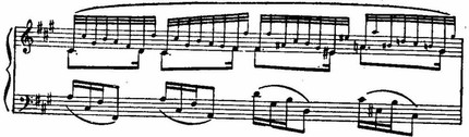 Прелюдия H-dur. Вкрадчиво игрива „речь" мелоса. Тональный план прост (Н—gis—Н). Такты 21-25 — внезапный перелом и торможение, поскольку нарушается периодически равномерная ритмика двутактов.
