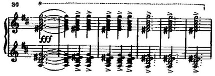 Вслед за этими аккордами стремительные взбеги типичных хроматических обыгрываний. Тонический взбег, плагальный взбег, затем скат с хроматическими кручениями на доминанте. Этот вихрь восьмых заканчивается новым громким возгласом — ходом в уменьшенный септаккорд седьмой ступени си минора и мгновенным провалом... Слышен горестный каданс с интонациями стонов в си миноре (очень их напоминают стоны в начале финала шестой симфонии Чайковского). Так завершается первый период скерцо, уже содержащий в себе законченный образ страстного, отчаянного порыва и скорбной депрессии.