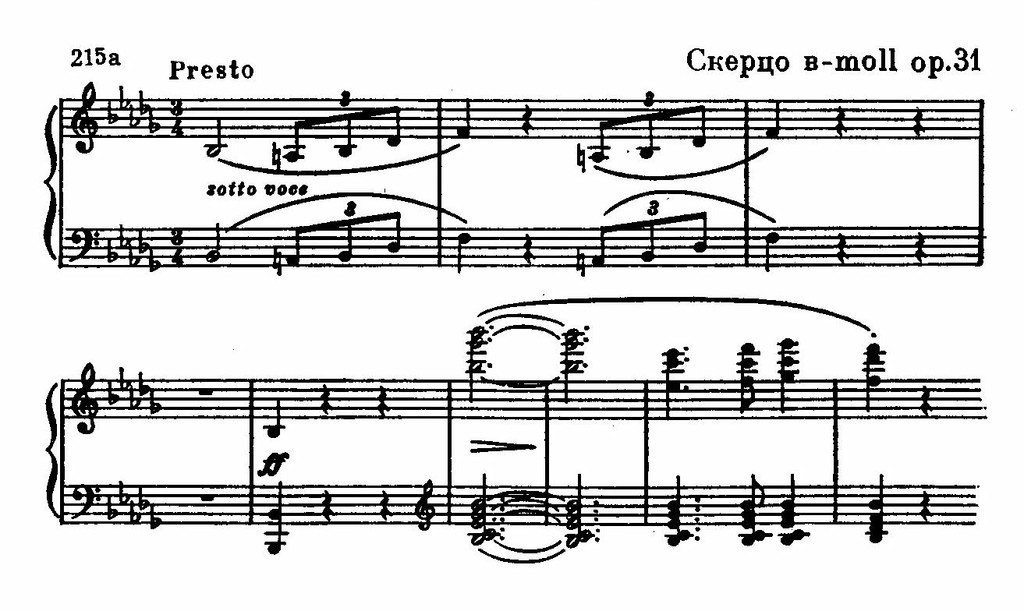 Третья часть Пятой симфонии, подчиненная внешним жанровым признакам скерцо, тем не менее окрашена в трагические тона и пронизана «стучащим», тревожным мотивом судьбы. В Девятой симфонии скерцо в высшей степени драматизировано и окрашено в зловещий колорит. Шопен развил подобные тенденции до предела. Можно проследить, как в его скерцо своеобразно романтично и пианистично преломляются и бетховенский прием резких, стаккатных звучаний (пример 215 б), и «разорванных» ритмов, и контрастное противопоставление тембров (пример 215 а), и безостановочное быстрое движение (пример 215 в):