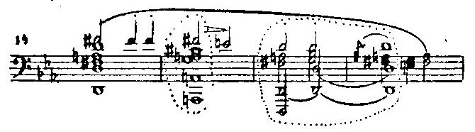 Но ряд элементов будущего в первой части сонаты налицо. Это не только отдельные характерные детали мелоса, фактуры, гармонии, но и определенная окраска, настройка музыки, предвещающие многое в дальнейшем творчестве Шопена. Особенно показательна вторая тема (вернее, подтема) с ее выразительными подъемами-вздохами и уже весьма выделяющимся аккордом из двух малых и одной большой терций (Здесь этот аккорд (впоследствии главная гармония „Тристана" Вагнера) дан в разбитом виде (f — as — с — d). Вагнер в „Тристане" предельно широко использовал аккорд, который как выразитель эмоций томления сформировался у ряда композиторов эпохи романтизма (и, в частности, у Шопена).):