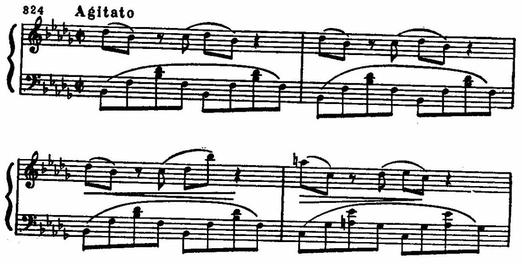 Есть некоторое сходство между репетирующей основной ритмо-интонацией скерцо и некоторыми ритмическими оборотами заключительной партии первой части: