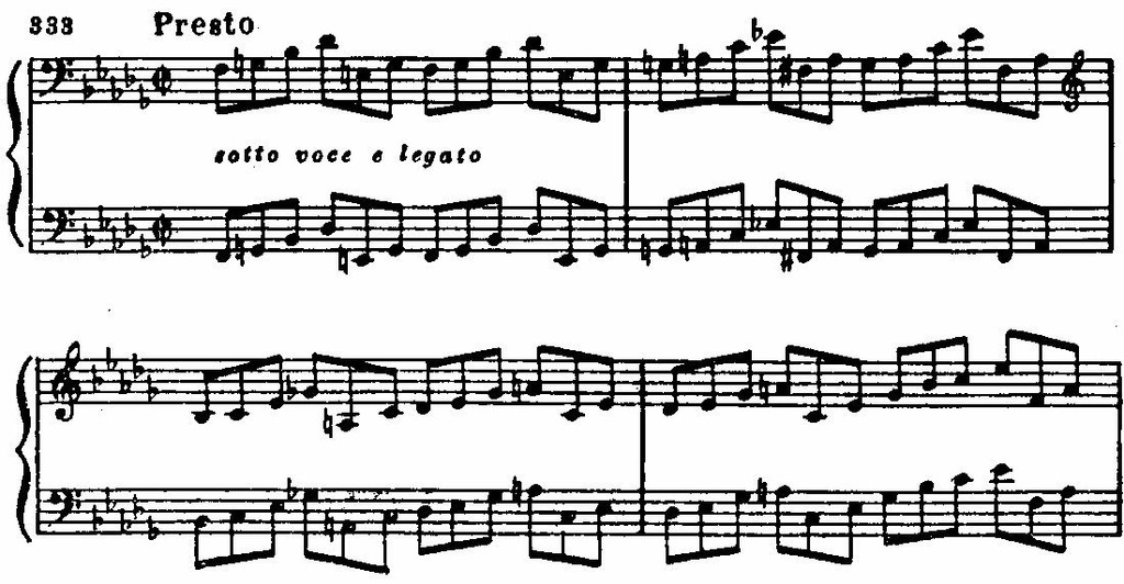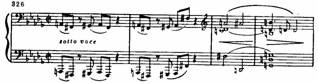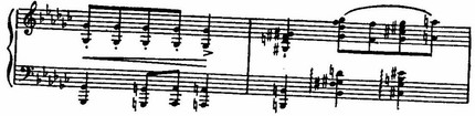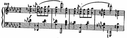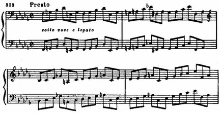 Обыгрывания играют в финале огромную роль. Наряду с господствующими уменьшенными септаккордами, сдвигами, хроматическими секвенциями и т. д. они поддерживают в финале почти беспрерывную в нетональность (характерна, например, секвенция ломаных трезвучий в тактах 9—10: lb—IA—IAs—IG—Ih—IGes). Едва появляется ясная диатоническая мелодика с намеком на светлые краски (в тактах 24—30), как тут же быстро тонет в потоке модуляций и хроматизмов. В конце, после мрачно замирающих и прерывающихся в басах пассажей,— внезапный резкий каданс, точно крик, болезненный и страшный.