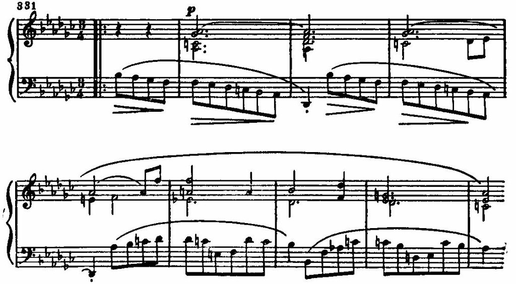 Весьма оригинально в первой части сонаты преобразование сонатного allegro. Разработка, с ее мощным развитием первой темы, выполняет одновременно и функцию начала репризы, ибо «настоящая» реприза начинается сразу со второй темы. Итак, тут завершена тенденция уничтожения первой темы в репризе, намеченная еще первой частью концерта f-moll. Суть подобной тенденции понятна — она вытекает из принципа максимально отчетливой контрастности романтических антитез. Конечно, в тенденции подобного сокращения состава репризы Шопен имеет предшественников. Укажем, для примера, на первые части сонат ор. 31 № 2 и op. 111 Бетховена, а затем на первую часть сонаты ор. 24 Вебера и на первую часть концерта ор. 5 Тальберга. Поэтому не следует думать, что Шопен явился изобретателем данной «антитетической» формы сонатного allegro. Однако именно Шопен доводит ее до замечательной ясности, совершенства и драматургической мощи. А тем самым она становится его исторической собственностью.