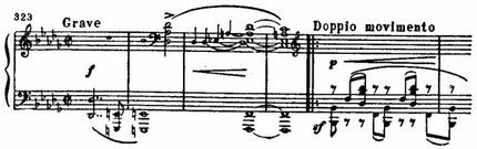 Весь этот период (такты 41—81) гениально выразителен длиной и напряженностью мелодических линий. Но вслед за ним особенно ясно обнаруживается принцип романтической антитезы — замкнутость контрастных образов. В такте 81 развитие второй темы внезапно обрывается и заключительная партия с ее резким сжатием (ритмического масштаба, блестяще суетливыми хроматизмами и энергичным кадансом как бы обрубает страстный лирический порыв.