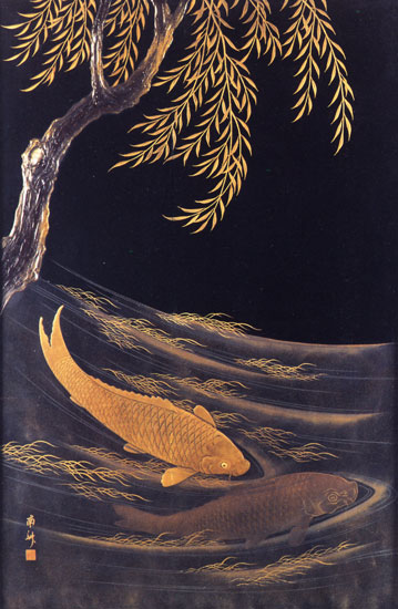 При создании последней пьесы сюиты – «Золотые рыбки» – источником вдохновения послужило лаковое японское панно, украшавшее кабинет композитора (его и сегодня можно увидеть в Музее Дебюсси). Здесь вновь возникает образ водной стихии, к которому композитор обращался многократно на протяжении своей творческой жизни («Сирены», «Ундина», «Игра волн»). Тему, излагаемую параллельными терциями, сопровождает тремоло тридцать вторыми. Очень выразительно ладовое «мерцание» минора и мажора.