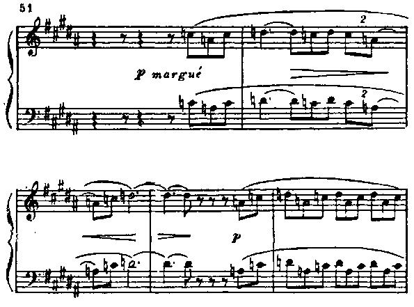 В партитуре первой части немало оттенков и контрастов. Нельзя не обратить в данном плане внимание на некоторые фрагменты. Так, в эпизоде Meno mosso, росо а росо выразительно выступают низкие кларнеты, а несколько дальше выделяется полиритмия, где одновременно звучат группы по четыре, по шесть и по девять шестнадцатых в такте (размер 3/8) (Это типичный прием насыщения ритма трепетом перебивок, которого мы уже касались выше,— в связи с последними тактами «Моря».). Эффектный гаммовый скат арф (опять со сложной полиритмией оркестра) в конце первого раздела (с одним диезом в ключе) приводит к мощному удару на доминантовом нонаккорде ми-бемоль мажора (опять нонаккорд дан как эмоциональная вершина!). Этот контрастный скачок в ми-бемоль мажор (три бемоля в ключе) поистине «ослепителен»! По духу же своему он близок к более простому гармонически, но явно, родственному сдвигу соль мажор — ми-бемоль мажор во вступлении к первому действию «Салтана» Римского-Корсакова (см. также первый номер симфонической сюиты из музыки этой оперы).