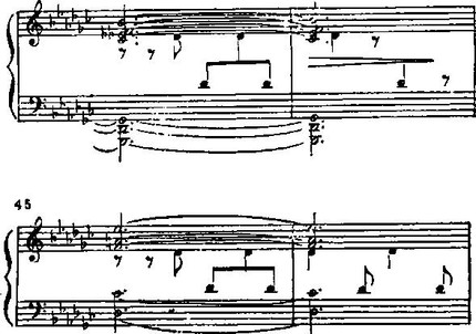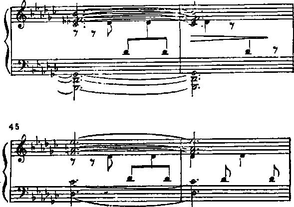 Образный смысл дальнейшего (шесть бемолей в ключе) очень ясен. Пыл волнения опять затих (Вспомним, что самая тональность соль-бемоль мажор (фа-диез мажор) связывалась в «Пеллеасе» с образами умиротворенности, сладких надежд (конец 1-го акта).) и появляется даже баюкающий бальзам пентатоники (нисходящие октавы правой руки), вслед за которой звучат «сладостные» нонаккорды.