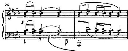 Дальше — неудержимое crescendo и фанфарные ходы к кульминации до мажора. Это как будто вершина, но Дебюсси делает еще секвенционный подъем — в ре мажор. Здесь, по законам классической музыки, должно было бы появиться нечто особенно важное. Однако Дебюсси вдруг обрывает экстатическую звучность, и музыка рассыпается в колоритных журчаниях и шелестах (с тремя «пятнами» нонаккордов — от фа, ми-бемоль и ре-бемоль).