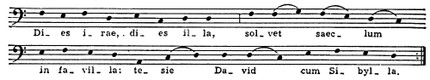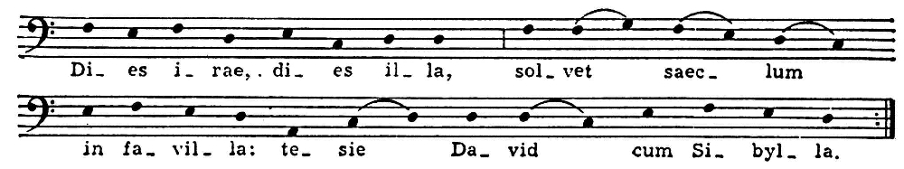 Текст Dies irae входит в состав заупокойной мессы (реквиема). В старых реквиемах использовался и сам напев Dies irae, излагавшийся одноголосно или в качестве тенора полифонич. ткани. Хотя текст Dies irae и представлен в реквиемах мн. композиторов 18–20 вв. (В. А. Моцарт, Л. Керубини, Р. Шуман, Г. Берлиоз, Дж. Верди, А. Дворжак, Б. Бриттен и др.), обычно они создавали на него свою музыку. Иногда образ Dies irae развёртывается лишь в одной части («Реквием» Моцарта), в др. случаях служит своего рода лейтмотивом, повторяясь несколько раз и являясь тем самым носителем осн. идейного и интонационного содержания произв. («Реквием» Верди). В ряде реквиемов Dies irae вместе с Tuba mirum (чудесная труба) вносит в музыку черты картинности, декоративности и создаёт образ стихийно разбушевавшейся грозной силы (реквиемы Моцарта, Берлиоза, Верди).