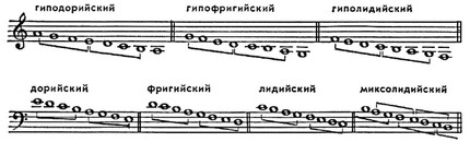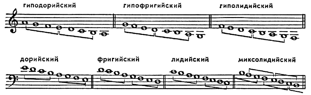 Побочные — гиполады производились от основных путём перестановки тетрахордов и дополнения звукоряда до октавы (названия греч. ладов не совпадают c позднейшими европейскими). Cхема семи октавных ладов:
