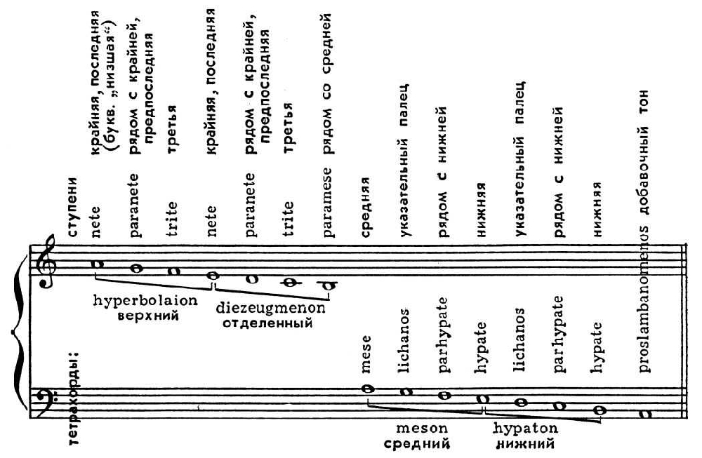 Hазв. ступеней происходят от места извлечения данного тона на струн. инструменте кифаре. Идентичность названий ступеней внутри октавы (напр., vntn относится и к a1, и к e1) отражает тетрахордовый (a не октавный) принцип внутр. строения системы. Дp. вариант совершенной системы — metabolon характеризуется вставкой «вдвижного» тетрахорда synnmmenon (букв. — соединённый) dl — c1 — b — a, расширяющего объём системы.