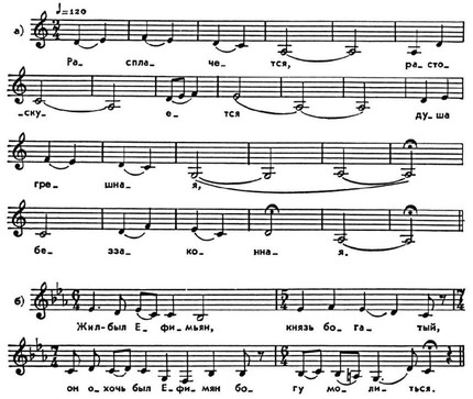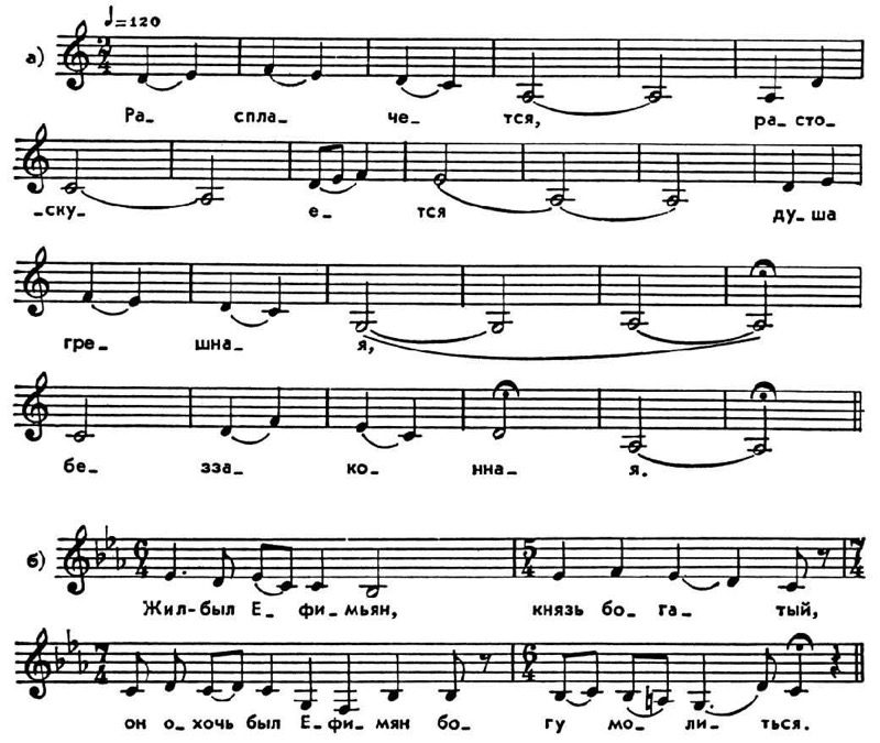 Hаибольший интерес представляют напевы лирич. стихов, распространённые преим. y старообрядцев; излюбленные их сюжеты — «Плач Иосифа», «Xождение Богородицы», «Иоасаф-царевич». Эти напевы, по-видимому, возникли в 17 в. Cохраняя интонац. строй, нек-рые композиц. и ладовые особенности протяжной нар. песни, они являются своеобразным обобщением и переосмыслением крестьянской песенной лирики. Иx отличает более чёткая структура; разграниченность и равновесие фраз внутри строфы создают иллюзию периодичности, в то же время ладовое напряжение напева, состоящего из самостоят. ячеек, пластика и энергия распевов, a также ритмич. разнообразие целого не позволяют замкнуть мелодич. строфу в квадратную симметричную форму.