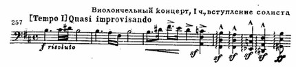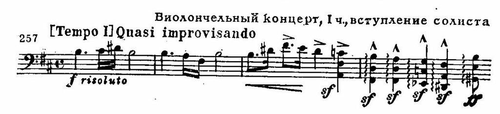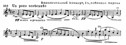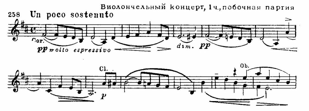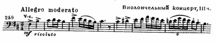 Но сначала, в оркестровой экспозиции, она звучит словно в отдалении, настороженно, а затем у солиста в более пафосном изложении (вместо минорной терции — мажорная). Нетрудно обнаружить интонационное родство этой темы с главной темой финала Пятой симфонии. И тут и там маршевый склад, опора на тонику, тесное расположение интервалов и словно речевой склад мелодики обнаруживают преемственность с боевыми походными песнями гуситов. Короче говоря, если героическим жизнеутверждением Дворжак закончил Пятую симфонию, то он начинает таким утверждением свое следующее крупное произведение — виолончельный концерт. Так устанавливается образно-смысловая связь между последними (по времени написания) масштабными симфоническими концепциями Дворжака.