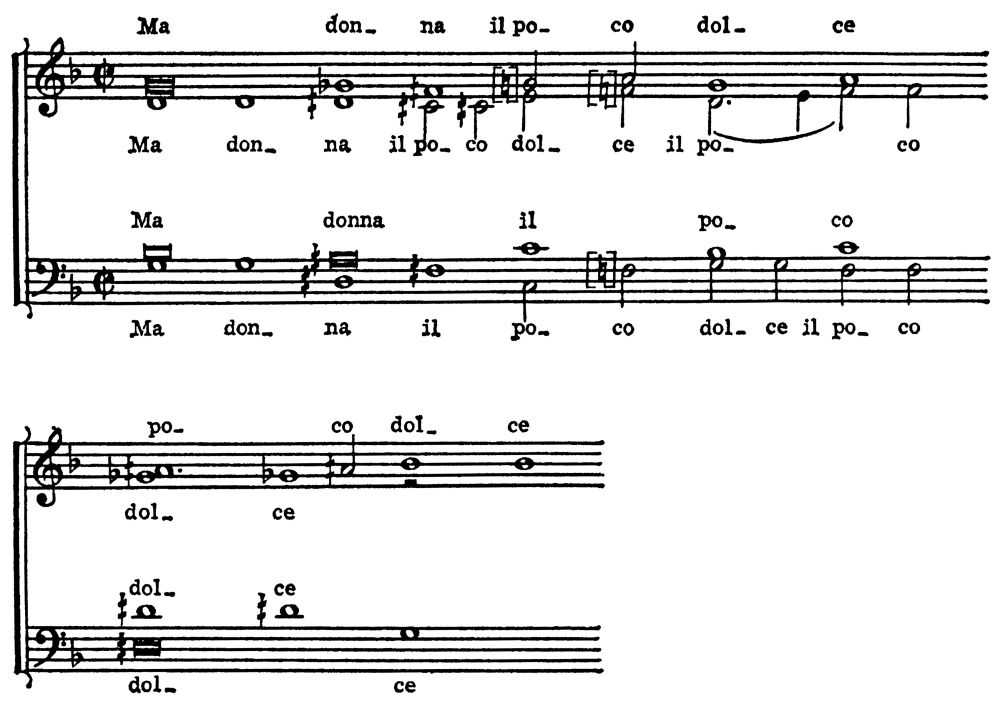 Н. Вичентино. Мадригал «Ma donna il росо dolce» из книги «L’antica musica» (Roma, 1555).