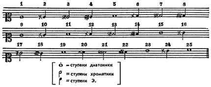 Для мелодии энармонич. рода характерно мелизматич. опевание опорного тона прилегающими к нему микротонами (сходно с античной хромой, см. Хроматизм), типичен утончённый, изнеженный выразит. характер («этос»). Специфич. интервал Э. — четвертитон (греч. diesis — энармонич. дийса). Энармонич. пикн (pyknon, букв. — скученно, часто) — участок тетрахорда, где помещаются два интервала, сумма к-рых меньше величины третьего. Сохранившийся; образец Э. см. в ст. Мелодия (1-й стасим из «Ореста» Еврипида, 3–2 вв. до н. э.). В эпоху средневековья и раннего Возрождения Э. в муз. практике не использовалась (впрочем, известен случай упоминания Э. в кодексе Монпелье, 11 в.; см. Gmelch J., 1911), но по традиции фигурировала во многих муз.-теоретич. трактатах. У Н. Вичентино (16 в.) встречаются образцы одноголосия с Э. (см. пример в колонке 218) и 4-голосия (передано в нотации 20 в.; означает повышение на 1/4 тона):