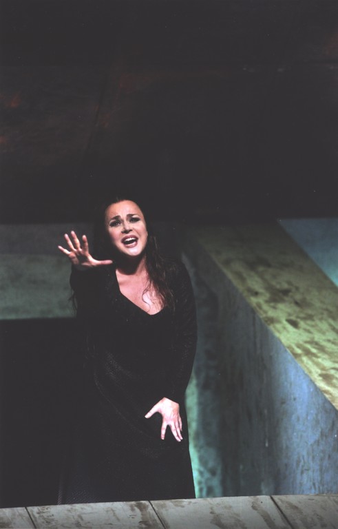 Впервые «Гермиона» была поставлена в Пезаро в 1987 году (режиссер – Роберто Де Симоне, дирижер – Густав Кун). Этот спектакль давно уже стал достоянием впечатляющей фестивальной истории, ведь в главных партиях тогда в нем блистали Монтсеррат Кабалье (Гермиона) и Мэрилин Хорн (Андромаха). Постановка была задумана помпезной, поражавшей воображение своей сценографической роскошью, ее картинная монументальность являлась недвусмысленным отголоском барочной итальянской традиции XVIII века. Премьера 2008 года – второе обращение к этому названию (режиссер – Даниэле Аббадо, сценограф – Грациано Грегори, художник по костюмам – Карла Тети). Абстрактная сценография спектакля – замкнутая коробка, безжизненное, на первый взгляд, «геометрическое царство» прямых линий, наклонных плоскостей и острых углов, символизирующих жесткий, диктаторский нрав Пирра, повелевающего в этом пространстве каждой его точкой. Характерная цветовая гамма спектакля – сочетание серого и красного, черного и белого. Наклонная трансформирующаяся авансцена представляет собой казематы, в которых томятся троянские пленники, над ними возвышаются «царские чертоги», красное зарево на заднем плане которых ассоциируется с алчно-кровожадными притязаниями Эпирской знати и самого правителя здешних мест.