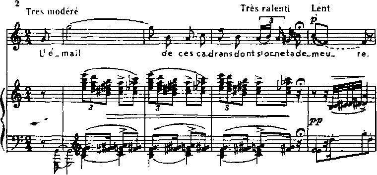 Здесь колоритна инструментовка — тонкая, прозрачная, с терцовыми ходами альтов и виолончелей divisi, играющих portamento (прием, часто встречающийся у струнных в паритуре Равеля). Красочны несколько тактов, сопровождающих уход Торквемады, — ff оркестра, расцвеченного пассажами деревянных и глиссандо первой скрипки и виолончели. Этот один из эпизодов, где оркестр является носителем действия, дополняя сказанное актером. Вообще оркестр редко выступает только в роли аккомпаниатора, да и в таких случаях его звучность клоритна и характерна. Вот почему клавир дает самое приблизительное представление об истинном облике оперы, создаваемом в значительной и важной части средствами тембровой драматургии.