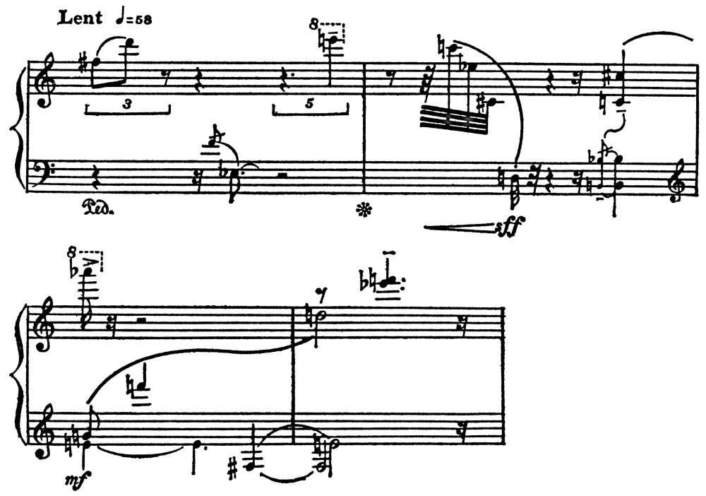 Возникновение в новой музыке 20 в. нетрадиционного склада, не относящегося ни к гармоническому, ни к полифоническому, определяет соответствующие разновидности Ф.: нижеследующий фрагмент произв. показывает характерную для этой музыки разорванность, несвязность Ф. — регистровую расслоённость (независимость), динамич. и артикуляц. дифференцированность: