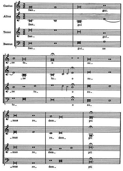 Для полифонической фактуры типичны единство рисунка, отсутствие резких контрастов звучности, постоянное число голосов. Одно из примечательных свойств полифонич. Ф. — текучесть; полифония. Ф. отличает постоянное обновление, отсутствие буквальных повторений при сохранении полного тематич. единства. Определяющее значение для полифонич. Ф. имеет ритмич. и тематич. соотношение голосов. При одинаковых длительностях во всех голосах возникает хоральная Ф. Эта Ф. не тождественна аккордово-гармонической, поскольку движение здесь определяется развёртыванием мелодич. линии в каждом из голосов, а не функциональными отношениями гармонич. вертикалей, напр.: