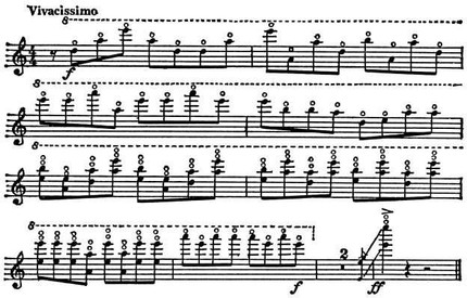 В скрипичной лит-ре 18 в. (в творчестве венских классиков) Ф. применялись очень ограниченно (В. А. Моцарт, концерт No 4 для скрипки, часть 2; Л. Бетховен, концерт для скрипки, часть 1), хотя игра Ф. практаковалась уже в 1-й половине этого века (Ж. Ж. де Мон-донвиль, «Les sons harmoniques», 6 сонат для скрипки с basso continuo op. 4, 1738). P. стали систематически использоваться в 19 в. в связи с общим для романтизма интересом к звукокрасочной стороне музыки: встречаются в виртуозной сольной лит-ре, напр. при окончании быстрых пассажей (Ф. Мендельсон, концерт для скрипки, часть 3). Н. Паганини вводит в употребление сложнейшие двойные и тройные Ф. (см. пример выше); в орк. музыке в эпизодах фантастич. характера встречаются аккорды Ф. (Р. Вагнер, «Лоэнгрин», начало вступления), а также Ф. струнных в комбинации с Ф. арф (Г. Берлиоз, «Скерцо Маб» из симфонии «Ромео и Юлия», Allegretto). Особенно изобретательно применяются Ф. в орк. соч. К. Дебюсси (напр., «Море»), М. Равеля («Испанская рапсодия»), И. Ф. Стравинского («Весна священная»; «Поцелуй земли» — Ф. струнных), в частности в сочетании с glissando (Стравинский — «Жар-птица», вступление; Д. Д. Шостакович — «Нос», Сцена бритья), с pizzicato (Р. С. Леденёв — 6 пьес для струнных с арфой, ор. 16). Эффект звучания Ф. применяется на арфе (Шостакович — симфония No 5, часть 3, кода); Ф. встречаются в конц. лит-ре для гитары (М. Льобет — «Каталонская песня»; X. Турина — «Фанданго») и др. щипковых инструментов. Только одними Ф. играют на трумшайте. А. Шёнберг применил Ф. на фп. (3 фп. пьесы ор. 11, No 1).
