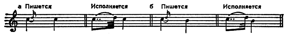 («плика нисходящая»). Эти знаки обозначали восходящее и нисходящее последования долгого и более короткого звуков (обычно в секундовом отношении). Позднее посредством разл. форм знака плики стали обозначать и длительность её звуков. Ф. в совр. смысле появился в 1-й пол. 17 в. Он не всегда обозначался в нотах; нередко, как и др. украшения, исполнитель вводил его по собств. усмотрению. Ф. означал гл. обр. выполняющий мелодич. функцию безударный звук перед сильной долей. Ф. снизу встречался чаще, чем Ф. сверху; оба эти рода существенно различались. Ф. снизу (франц. port de voix и accont plaintif в лютневой музыке, англ. beat, half-beat и fore-fall) обозначался занятой, перевёрнутой запятой, косой чёрточкой и др. знаками. Первоначально он исполнялся за счёт предыдущего звука.