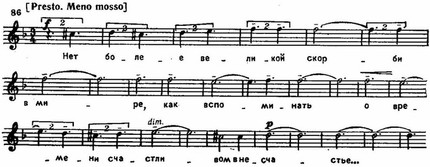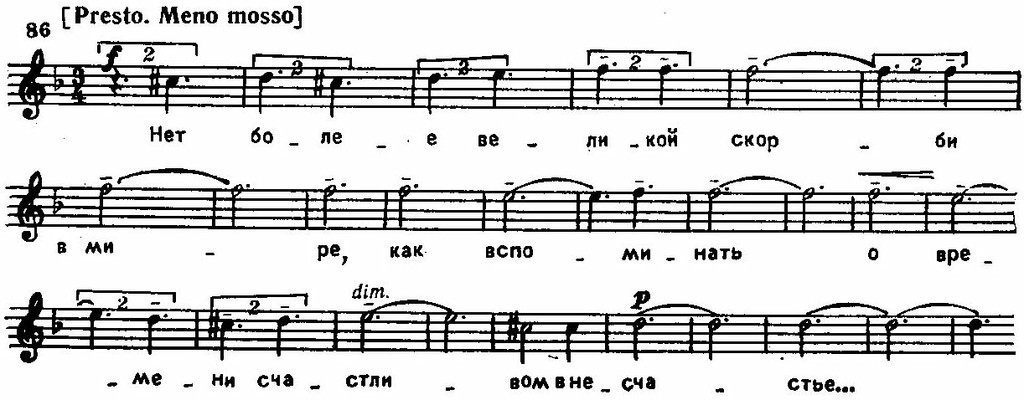 На фоне мягких протянутых аккордов деревянных духовых и струнных с мерцающими тремоло скрипок и звенящим тембром арфы Франческа и Паоло поют печальную фразу, которую затем в эпилоге повторяет хор: «Нет более великой скорби...» Мелодически эта фраза, основанная на видоизмененной теме фугато из оркестрового вступления, напоминает старинные русские церковные напевы. В ней можно уловить некоторые черты сходства с основной темой Третьего фортепианного концерта, близость которой к интонациям знаменного распева отмечалась не раз. Сходство это усиливается тональной общностью (d-moll) и одинаковым «амбитусом» мелодии, развертывающейся в пределах уменьшенной кварты между VII и III ступенями гармонического минора: