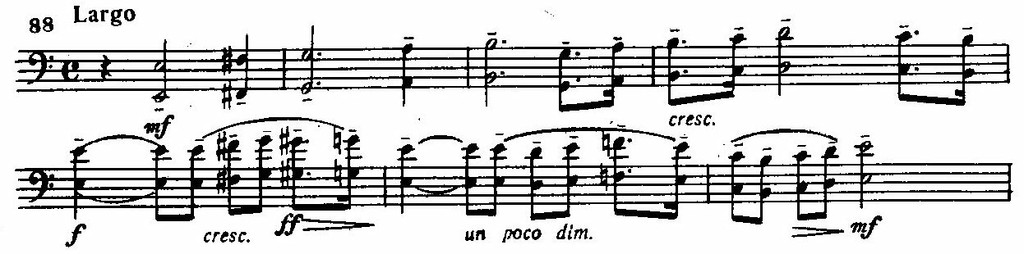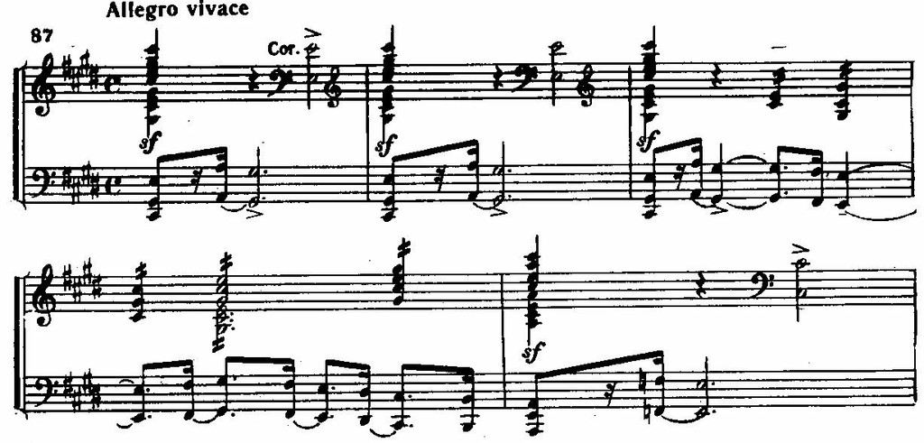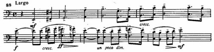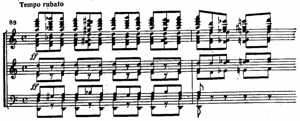 Звуковая ткань постепенно уплотняется, и на вершине этой второй волны медленно хроматически движутся целые аккордовые комплексы, как будто вздохи и стоны гонимых адским вихрем душ сливаются в один грозный вой.