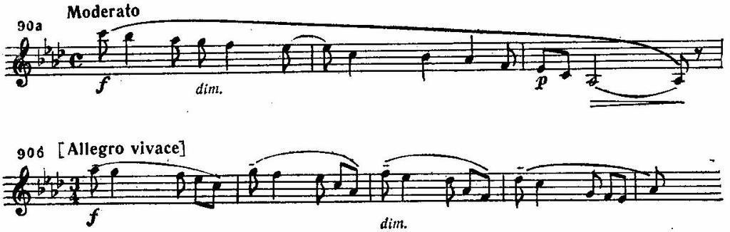 Вторая картина переносит нас в совершенно иной мир, олицетворением которого является светлый и чистый образ Франчески. Ее тема, эпизодически проходившая в прологе и первой картине, получает здесь широкое развитие, сохраняя при всех видоизменениях свой ясный и цельный выразительный характер. Это одна из поэтичнейших лирических мелодий Рахманинова, замечательная по своей «пространственной» протяженности, широте и свободе дыхания. Изливаясь из высокой вершины, она плавно и неторопливо опускается по диатоническим ступеням более чем на две октавы, с постепенным ритмическим торможением и расширением интервалов между звуками (пример 90а). Вариантом этой темы служит мелодическое построение из цепи секвенций (пример 90б):