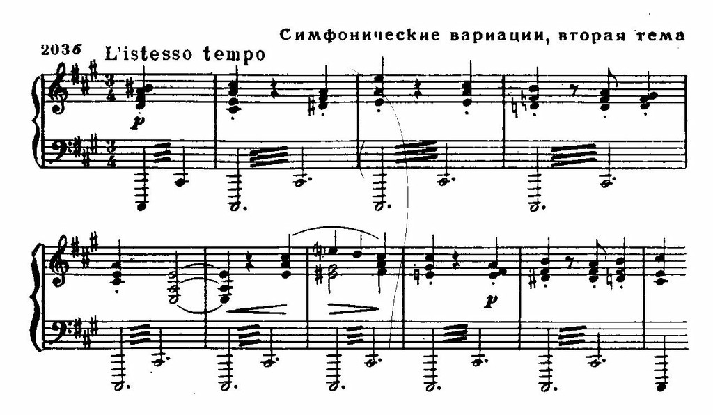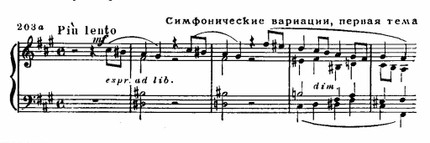Симфонии ре минор Сезара Франка не уступают в художественной ценности «Симфонические вариации» для фортепиано с оркестром (1885). Их композиция своеобразна. Это — вариации на две темы: первая более скорбного, «вопросительного» склада (Точнее сказать, это вторая фраза темы; первая — мужественная, энергичная — утверждается в оркестре, ей жалобно-вопрошающе отвечает солист. В характере такого противопоставления, очевидно, сказалось воздействие музыкальных образов второй части Четвертого фортепианного концерта Бетховена.), а вторая, звучащая издали, носит балладный характер: