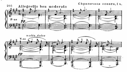 Одним из наиболее известных сочинений Франка является скрипичная соната. Сильно впечатляет ее начало, предвосхищающее излюбленные музыкальные образы Дебюсси: в звучании пасторальных зовов образуется нонаккорд. Эти «зовы», которыми пронизана вся первая часть, возникают и во второй части (побочная партия), и в третьей (начальный речитатив); их отголоски слышны в финале (эпизод e-moll):