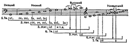 В начале 11 в. Гвидо д’Ареццо теоретически обосновал систему гексахорда. Шестиступенный звукоряд состоял из последовательности: тон, тон, полутон, тон, тон. Ступеням звукоряда были присвоены самостоят. слоговые обозначения: ut, re, mi, fa, sol, la, к-рые являлись первыми слогами строк церковного гимна: «Ut queant Iaxis». Общий звукоряд системы состоял из 20 звуков от G до е 2 и подразделялся на 4 регистра: низший, низкий, высокий, наивысший. В границах этого звукоряда строилось 7 гексахордов разл. высоты, причём структурная формула гексахорда не изменялась. В числе 7 гексахордов были 3 «твёрдых» — с си-бекаром, 2 «мягких» — с си-бемолем и 2 натуральных — в диапазоне до — ля. Эта система допускала сочетание различных по типу гексахордов и мутации (переходы) из одного гексахорда в другой. Принцип сольмизации по этой системе заключался в сохранении названий ступеней гексахорда при интонировании любого из 7 гексахордов.