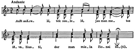 Литовская народная песня «Aust ausrele, tek saulele» («Занимается зорюшка, всходит солнышко»). Из книги Я. Чюрлёните «Литовское народное песенное творчество». 1966.