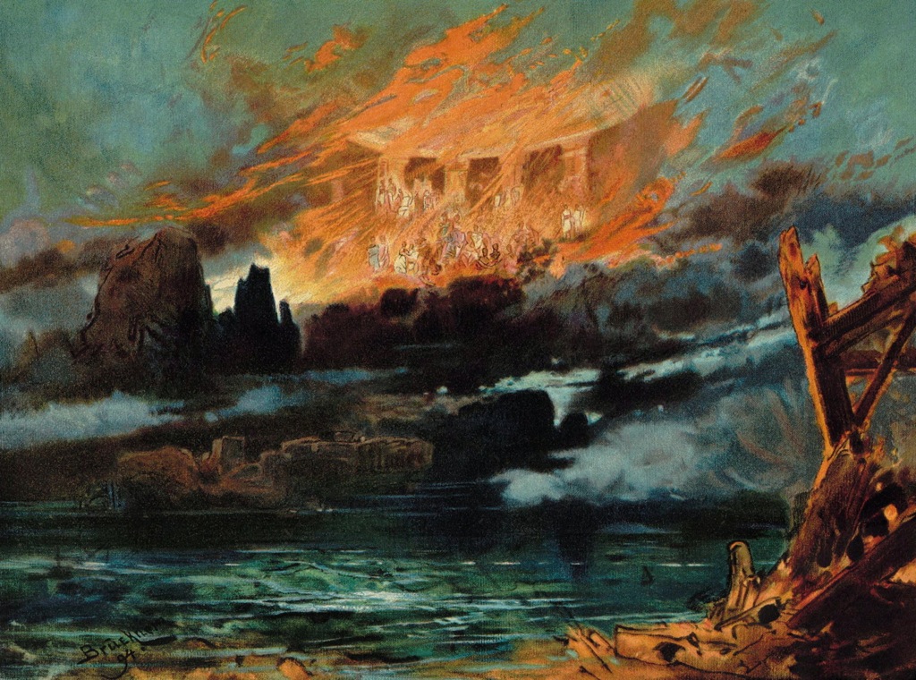 Тем временем огонь от горящего зала Гибихунгов достигает самых облаков, и в его свете становятся видны боги и герои, сидящие в зале Валгаллы, как это описано Вальтраутой в первом действии. Яркое пламя охватывает и их, и когда оно их полностью поглощает, в оркестре звучит мотив «Спасения любовью». Кажется, будто Вагнер говорит: весь мир возродится и новый порядок будет установлен через благородную любовь Брунгильды.