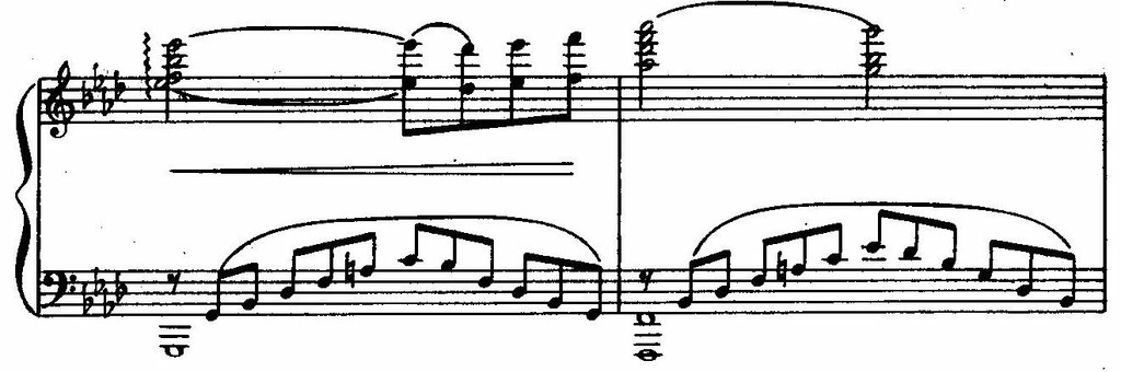 Обе темы первой части двухчастного фортепианного концерта приблизительно так же соотносятся между собой, как в скрипичном: взволнованной лирико-патетической теме главной партии противопоставлена более спокойная светлая тема побочной.