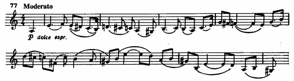 Проходящие хроматизмы (особенно звук IV повышенной ступени во втором такте) заостряют ее лирическую экспрессию, не нарушая, однако, плавного волнообразного развертывания мелодической линии, раскинувшейся более чем на полторы октавы. Более спокойная и светлая тема побочной партии, также излагаемая в партии солиста, содержит некоторые мелодические обороты, родственные первой теме (так, например, нисходящее движение по ступеням малого септаккорда воспроизводится в начале побочной партии в обращении).