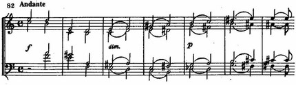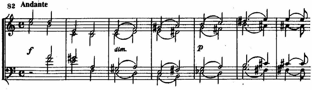 Это построение дважды повторяется со смещением временных интервалов между парами голосов, благодаря чему напряженность звучания нарастает, усиливается острота гармонических тяготений, не получающих устойчивого разрешения в пределах довольно развернутого вступительного раздела. Приведенное построение становится источником темы главной партии, но остро диссонирующие «столкновения» пар голосов превращаются в свободно развивающуюся мелодию, напряжение ослабевает и выражение мучительной скорби сменяется меланхолической задумчивостью. Эту тему дополняет более светлая спокойная тема побочной партии, но вступительные обороты в том или ином виде напоминают о себе в переходных разделах формы (связующая, заключительная партии).