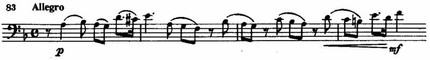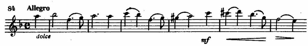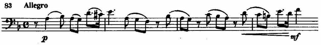 которой предшествует краткое фугированное Andante, до некоторой степени напоминает первую тему скрипичного концерта, но не обладает ее широтой и свободой дыхания: по своему мелодическому строению она, скорее, может быть отнесена к типу резко очерченных полифонических тем. Из ее начальной секундовой интонации вырастает ясная певучая тема побочной партии.