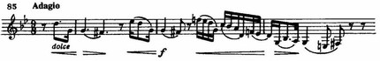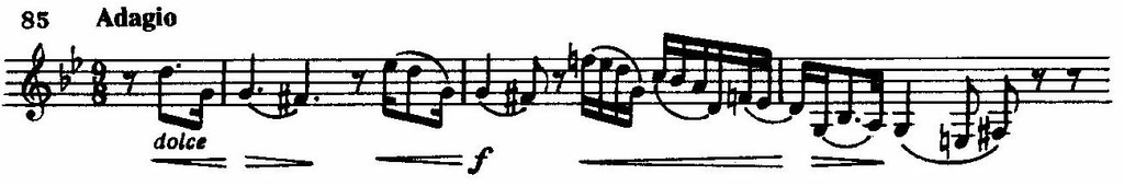 Грациозное скерцо в духе чуть манерного старинного танца напоминает Интермеццо из Шестой симфонии и аналогично ему по своей функции. Лирическим центром цикла становится скорбное Adagio con licenza с краткой, но выразительной темой, в основе которой лежит интонация ниспадающей квинты с завершающим ее малосекундовым ходом типа вздоха.
