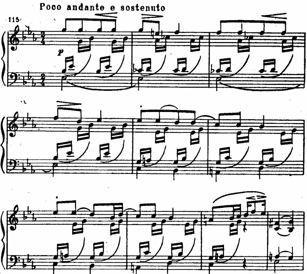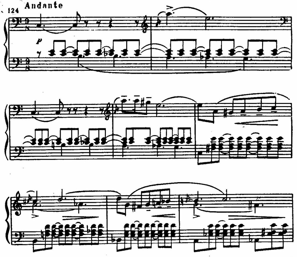 С новым вариантом мелодии в репризе появляются новые образные грани. Светлое звучание в высоком регистре, ясная тоничность сообщают теме спокойно-созерцательный, торжественный характер. Плавно и постепенно, опевая каждый звук тональности, сохраняя «чистоту» до мажора, спускается мелодия (ее диапазон — три октавы). Сгущение регистровой окраски и усиление звука приводят светлую, прозрачную тему к суровому, сумрачному звучанию. Кажется, что этому шествию мелодии не будет конца, Но вот резким тональным сдвигом (до мажор — ля-бемоль мажор) вводится новый вариант: тема звучит величаво, торжественно, чеканно.