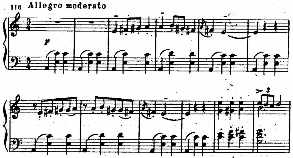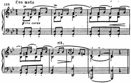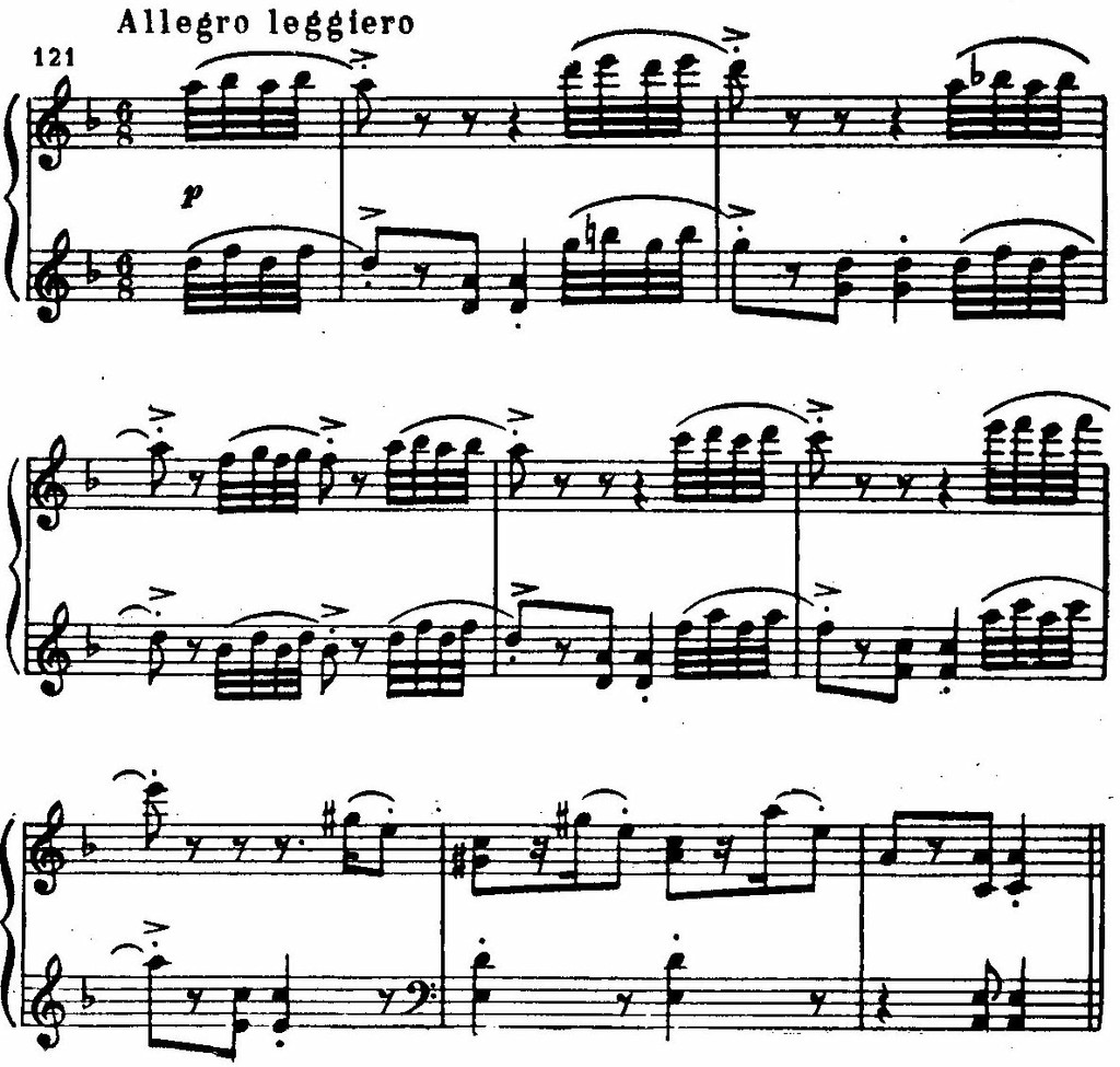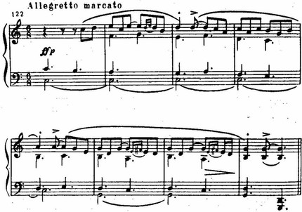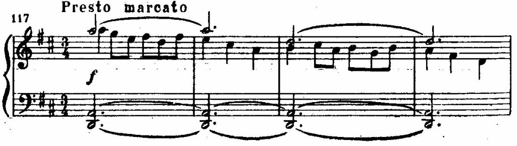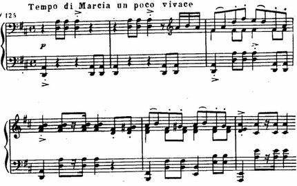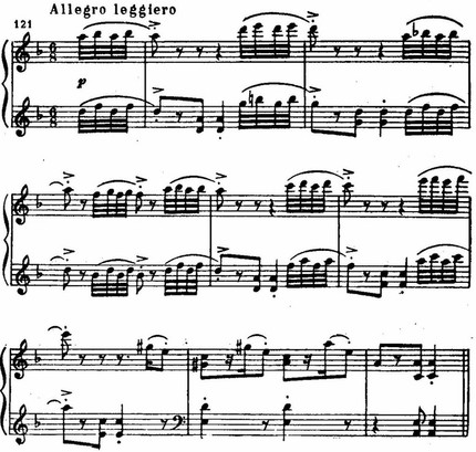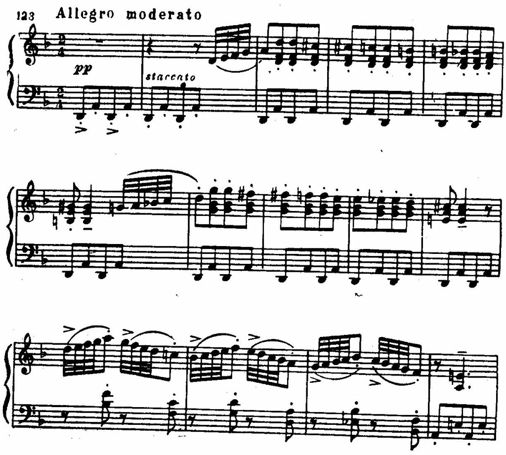 Свои контрасты есть и в крайних разделах формы, также трехчастных, Середина вызывает в представлении танцевальную сценку с противопоставлением энергичного мужественного движения и легких грациозных «па». Огромное нарастание мощи звучания, активности движения приводит к яркой, звонкой репризе, к кульминационному проведению темы, словно приподнятой предшествовавшими ей сильными, мощными аккордами.