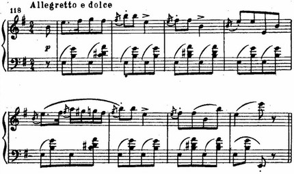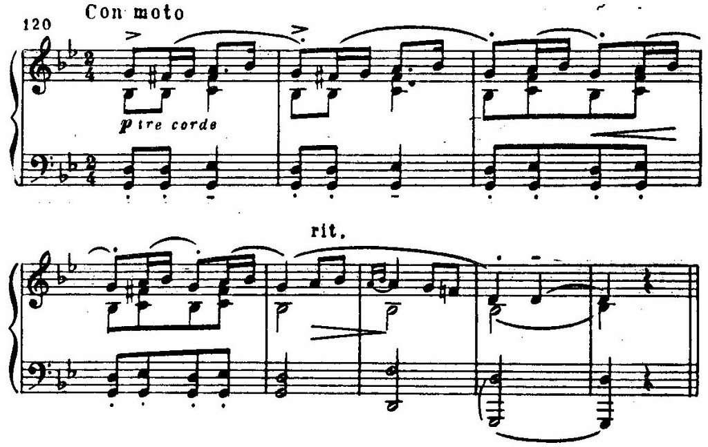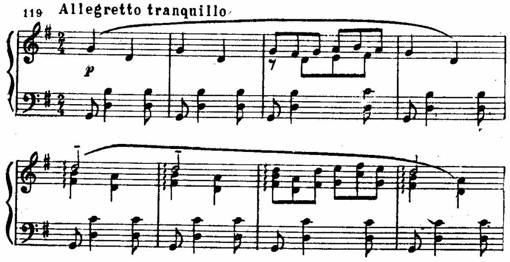 Устремленные вверх «разомкнутые» мелодические фразы, напряженность хроматизмов в гармонии, уводящей от ясных тяготений и устойчивости тоники, неожиданные мягкие и красочные тональные повороты — все это сообщает образу романтическую зыбкость, тонкость нюансов. Но начало мелодии вырастает из короткого наигрыша народного склада, словно доносящегося издали. Простой и понятный, вызывающий образные (пейзажные) ассоциации, он не включается в дальнейшее развитие мелодии, как бы оставаясь живым, «объективным» впечатлением. Так же естественно, продолжая лирический образ, возникают живописные образы: трели птиц, легкое дуновение ветерка.