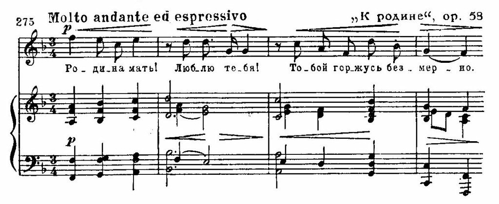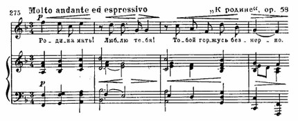 Сходными средствами выражены и чувства родственной любви — сыновней или материнской. Образцы тому содержатся в «Колыбельной» ор. 9, «Горе матери» ор. 15, «Мать поет» ор. 60 и других.