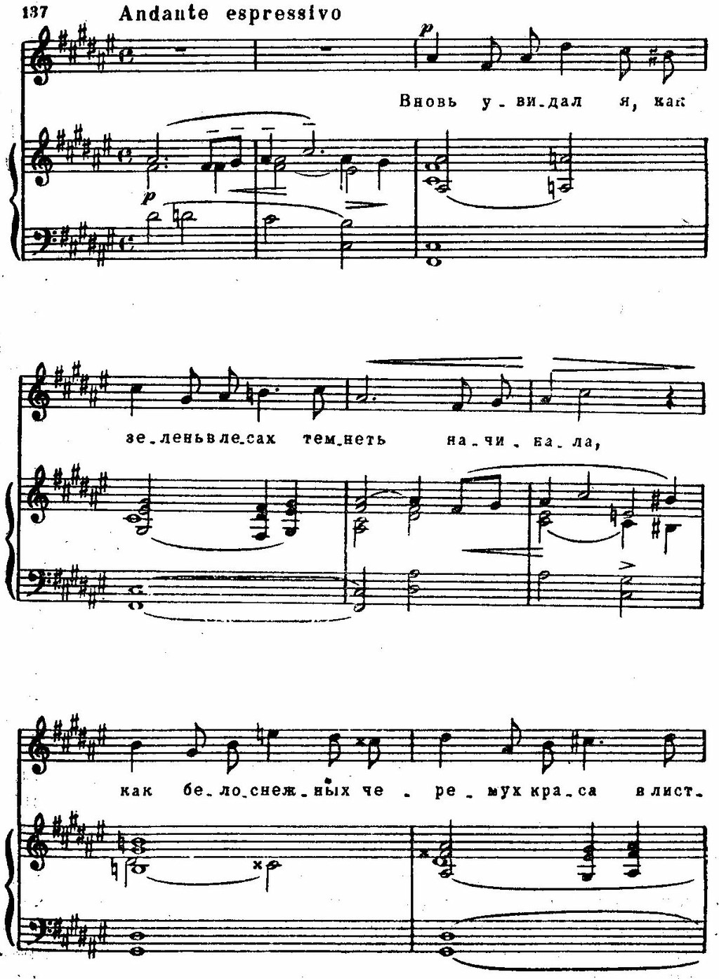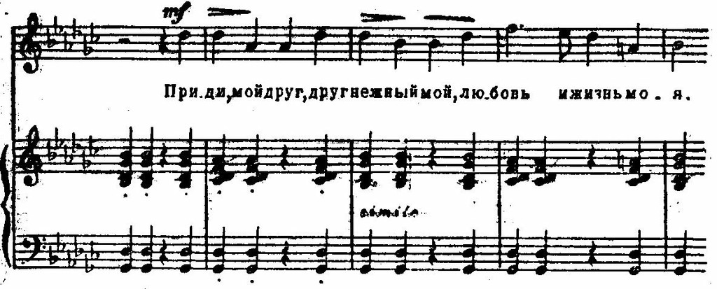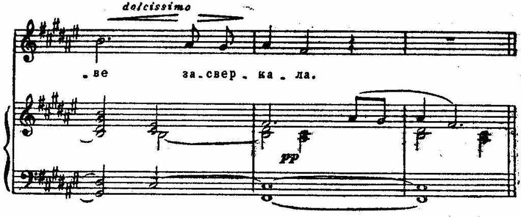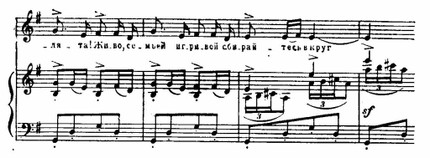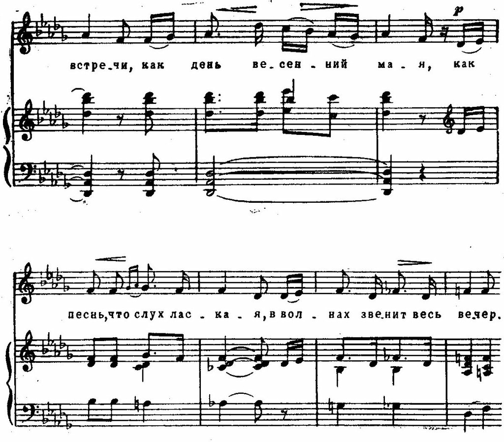 Эти образы «вписываются» в лирический строй песни, с ее стремительным порывом к счастью, с трепетностью чувства. Линии и краски отобраны предельно экономно; легкая, как трель, фигурка у фортепиано, «сверкающая» в разных регистрах, легкая не только благодаря подвижности, но и тому, что появляется на слабой доле такта; «кружащиеся» секвентные последования гармоний (вводный септаккорд — увеличенное трезвучие), намеченные прозрачными и легкими аккордами — синкопами: