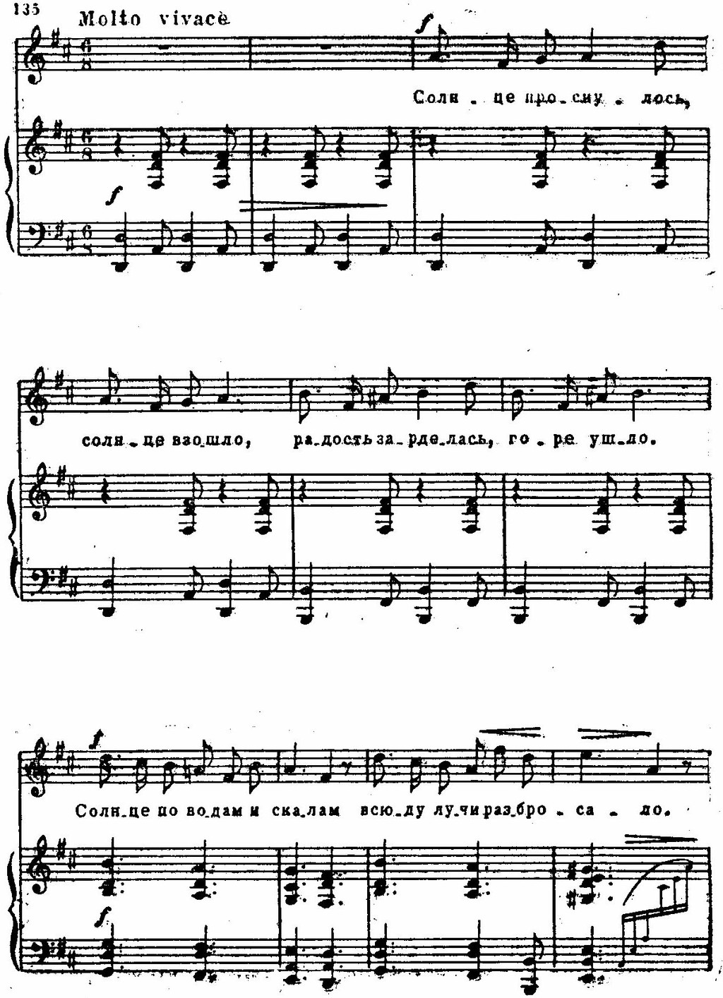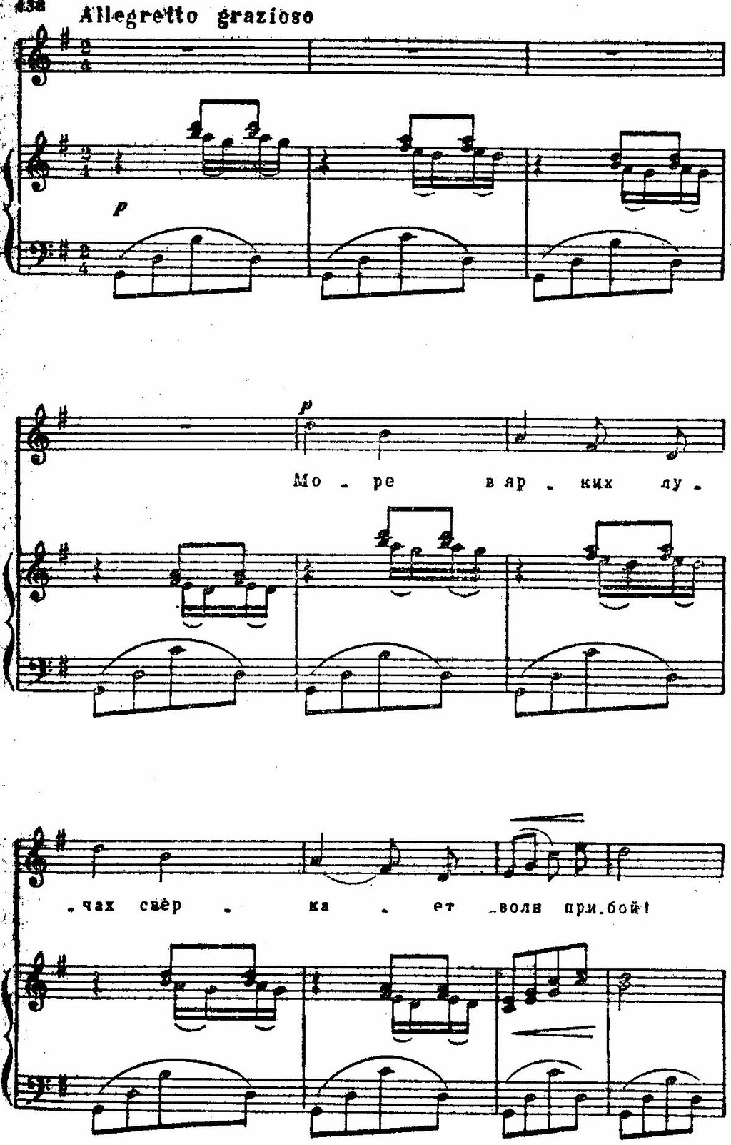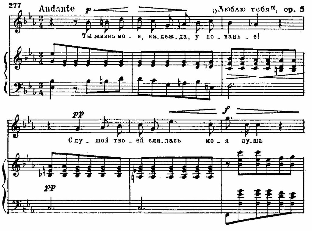 Эти образы «вписываются» в лирический строй песни, с ее стремительным порывом к счастью, с трепетностью чувства. Линии и краски отобраны предельно экономно; легкая, как трель, фигурка у фортепиано, «сверкающая» в разных регистрах, легкая не только благодаря подвижности, но и тому, что появляется на слабой доле такта; «кружащиеся» секвентные последования гармоний (вводный септаккорд — увеличенное трезвучие), намеченные прозрачными и легкими аккордами — синкопами: