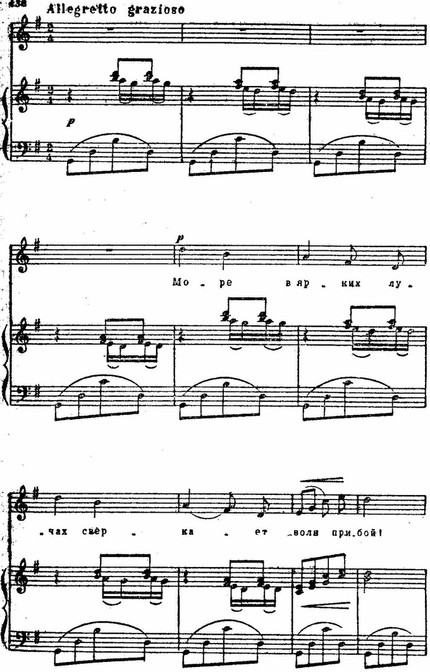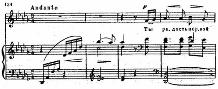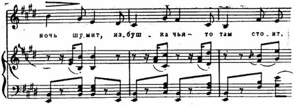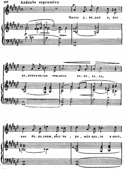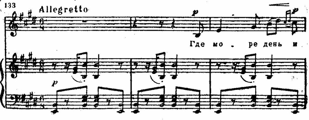 Очень тонко, не меняя общего характера движения, композитор переводит музыкальные образы от живописных, ярких — к эмоциональным («вдаль, вдаль простор манит»): исчезает прихотливость, появляется твердость, устремленность ритмики, зыбкие гармонические звучания сменяются устойчивыми. Резкий тональный контраст (соль мажор — фа-диез мажор) способствует четкости грани между разными образами поэтического текста.