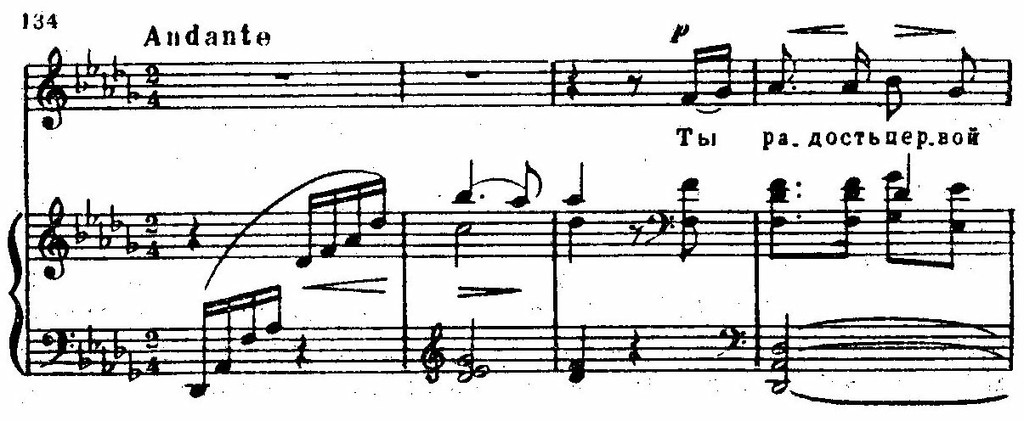 Мерное движение и малая подвижность мелодии в начале, строгость фактуры сопровождения и гармонии (выразительность плагальных оборотов минорной субдоминанты) создают ощущение величия и покоя. Эмоциональное напряжение в средней части достигается при еще большей концентрированности, скупости музыкальных средств. Гармония застывает на диссонантных звучаниях (септаккорд II ступени, вводный септаккорд двойной доминанты — на доминантовом басу). Мерная, спокойная мелодическая фраза достигает драматизма, увеличивая высоту и силу звучания, выделяя повторами вершинную, конечную интонацию. Красота тональной игры в репризе (фа мажор — ре-бемоль мажор — фа мажор), с постепенным просветлением регистрового колорита, воспринимается как торжество света и покоя.
