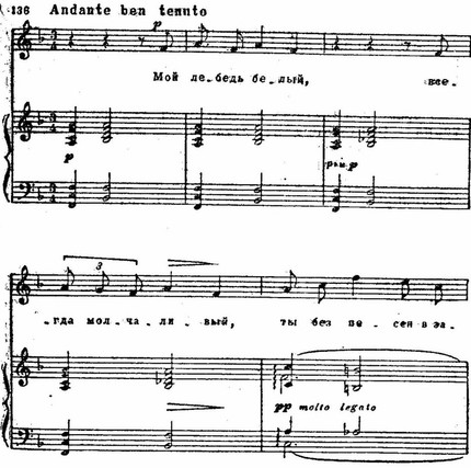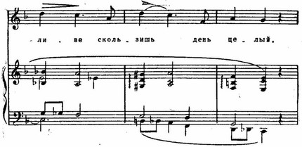 Зато заключение песни, основанное на широких разливах мелодии, с все увеличивающимися «волнами» мелодии, с постепенным «завоеванием» мелодической вершины, с напряженными мелодическими ходами отражает яркость, силу эмоций.