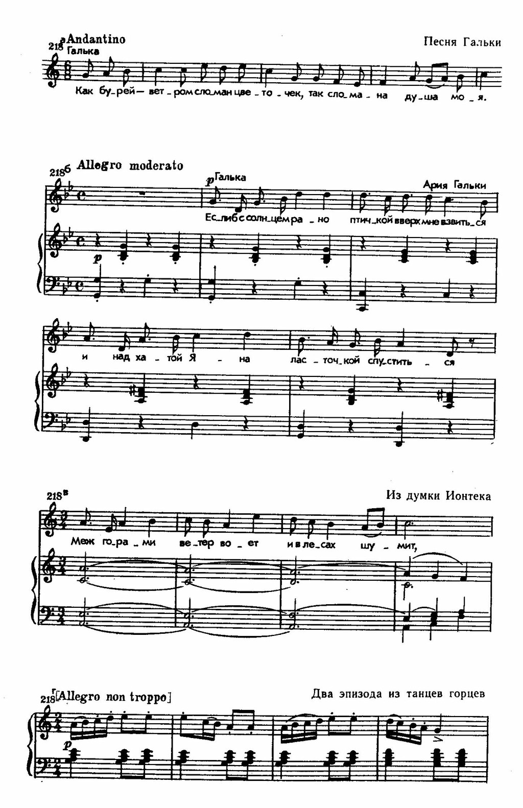 Так, образы крестьян Гальки и Йонтека связаны с народно-песенным складом. Их музыка проста, мягка, проникновенно мелодична. Песни Гальки как бы непосредственно перенесены из фольклора — столько в них простоты, наивности, плавной песенности. Думка Йонтека также обобщает наиболее характерные интонации польских и украинских песен. Ария Гальки «Если б с солнцем рано» и думка Йонтека вошли в народный польский и украинский быт наряду с фольклорными творениями.